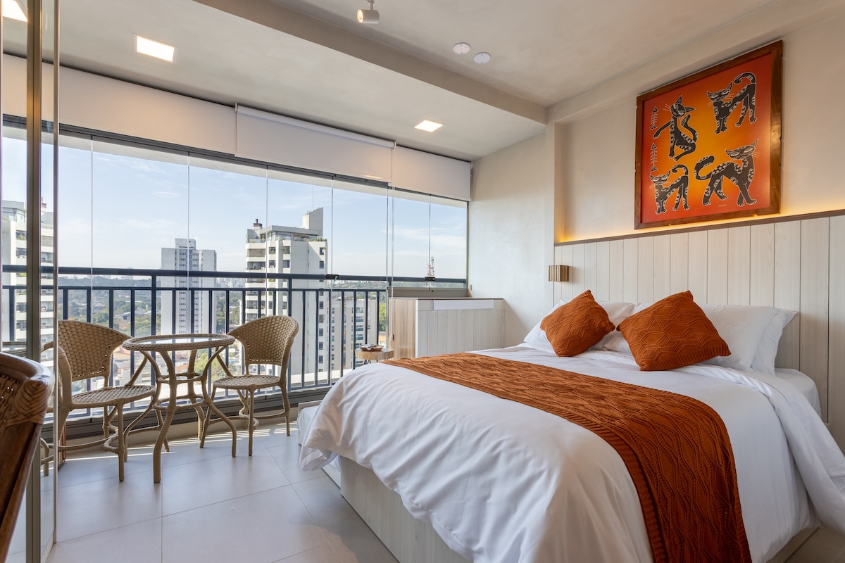 Loft Studio på 40 m2 planlagt og komplett for et komfortabelt opphold, med concierge-service i resepsjonen og alle fasiliteter og bekvemmeligheter i en leilighet. Den største planløsningen i leiligheten (40 m2) i en høy etasje. Komplett fritidsområde, treningsstudio, boblebad, badstue, svømmebasseng, kontorplass, internt minimarked, garasje inkludert i prisen, vaskeri og internett (i leiligheten og i alle fellesområder). God beliggenhet i nærheten av bedrifter, arrangementer og T-banen (stasjonene Alto da Boa Vista og Adolfo Pinheiro).