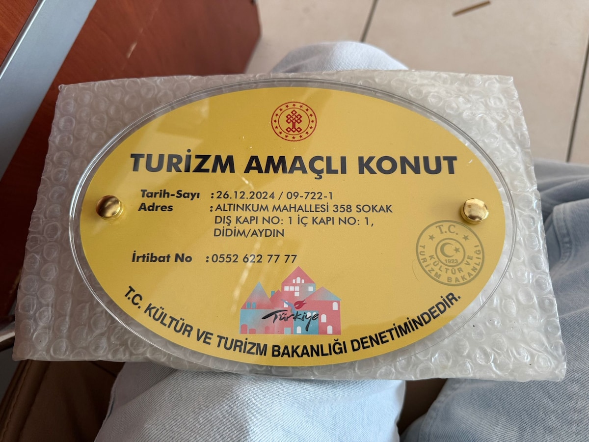 Huset vårt ligger på et sted i Didim Akbük. Det har tre etasjer, en romslig uteplass, en romslig terrasse og en hage foran og bak som omgir huset. Det er sitron-, granateple-, fiken- og oliventrær i hagen. Det er 7–8 minutters gange til Akbük-stranden (på siden med kaldt vann). Det er to minutters gange til minibusstasjonen i Akbük og bondemarkedet som er åpent på tirsdager. Det er også 15 minutters gange til alle markeder (Migros, A101, Bim, Şok) og basaren. Turistgodkjenning nr: 09-47-1