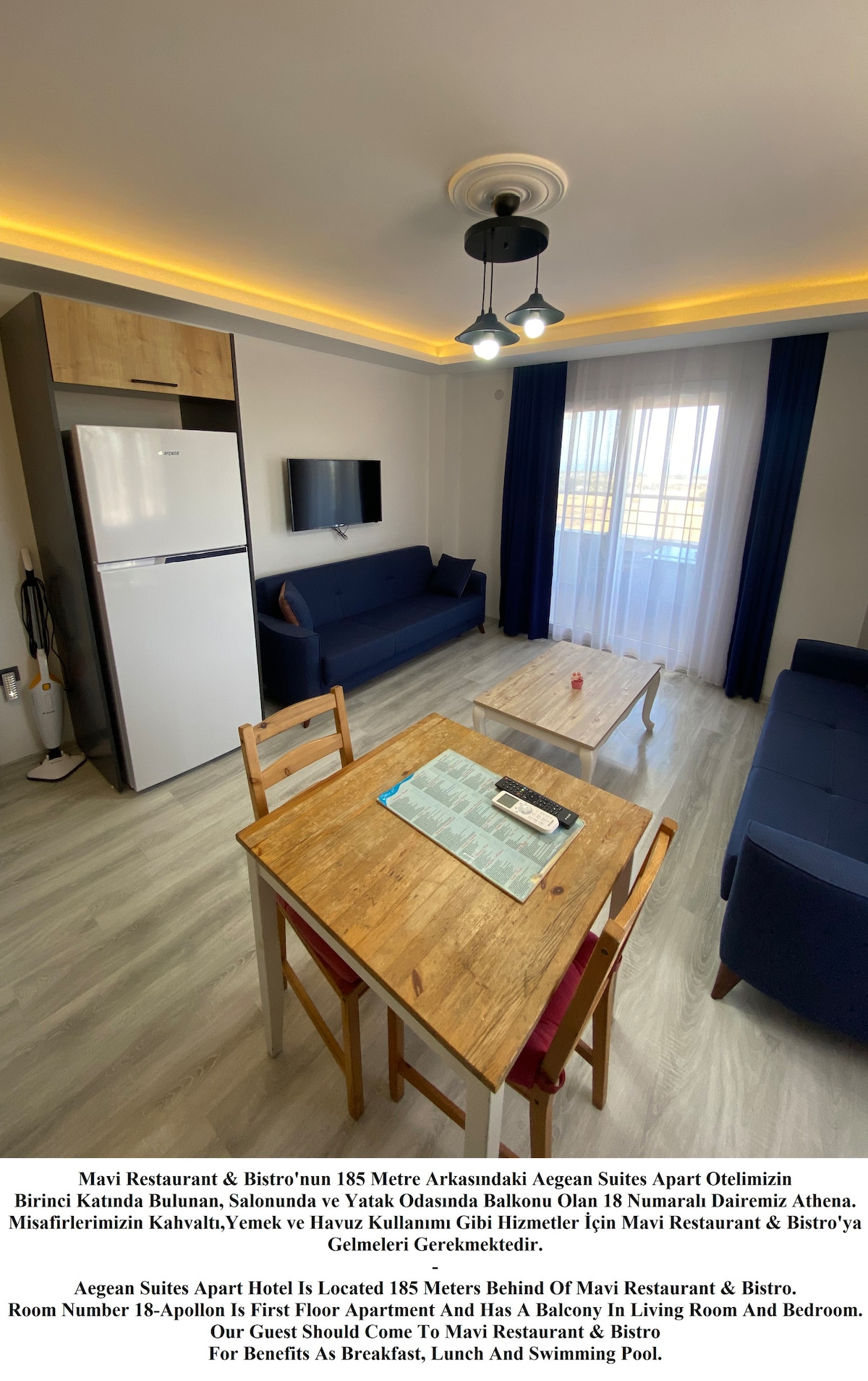 Vårt Aegean Suites Apart Hotel bak Blue Restaurant & Bistro 185 meter Leiligheten vår 17 med balkong i stuen og soverommet i første etasje er Apollo. Aegean Suites Apart Hotel ligger 185 meter bak Mavi Restaurant & Bistro. Romnummer 17-Apollon er første etasje leilighet og har en balkong i stuen og soverommet.