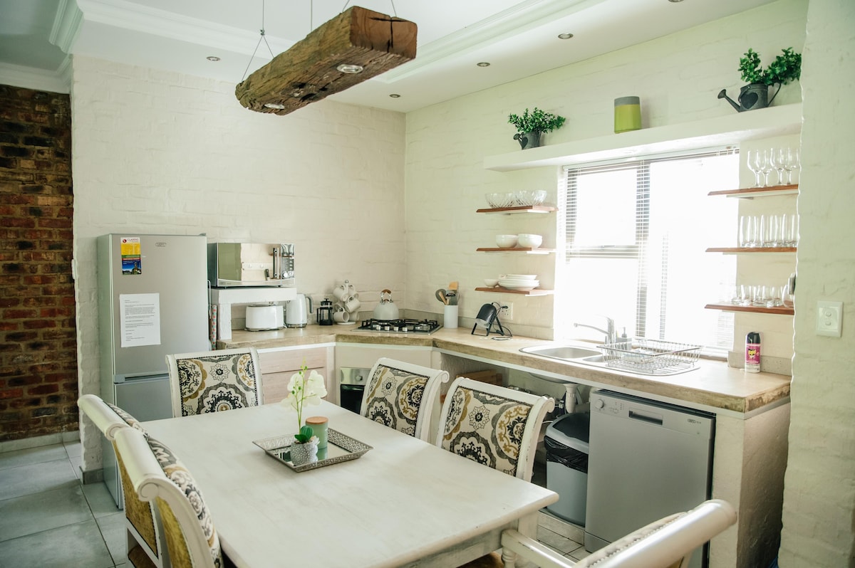 Dette unike stedet har sin helt egen stil. Leilighet med ett soverom og eget bad, som er knyttet til et hovedhus med selvbetjeningsfasiliteter. Stuen varmes opp av en vedfyrt peis, og soverommet har eget bad og klimaanlegg. Braai-fasiliteter på stedet samt en smart-TV med DSTV og trådløst nettverk. To til tre km fra sentrum, på en fjellside. Det er nederste nivået i et treetasjes hus, men helt privat og ikke påvirket av strømbrudd.
