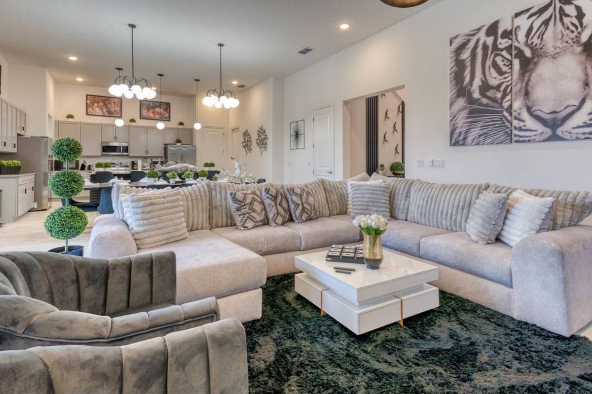 Nyt dette luksuriøse hjemmet med fem soverom og fem bad i nærheten av International Drive, bare minutter fra Orlandos beste attraksjoner. Det har 176 kvadratmeter stilig plass, et privat basseng, spillrom og temasoverom som er perfekte for barn. Slapp av i den koselige stuen med en smart-TV, eller lag mat på det fullt utstyrte kjøkkenet. Gjester har tilgang til Clubhouse-fasiliteter som et feriestedbasseng og treningssenter. Perfekt for familier eller grupper som ønsker komfort, moro og en førsteklasses beliggenhet for ferien.