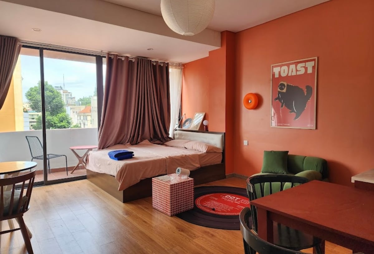 "Naturlig stemning" i studioleiligheten med balkong som lanserer en direkte utsikt mot det grønne og det gamle huset fra fjerde etasje. Sjelden unik leilighet i sentrum av distrikt 1 med en flott balkong. Moderne, rent, komfortabelt, med HEIS. Sentral spesiell beliggenhet, nær Ben Thanh-markedet, gå til turistattraksjoner, spis og drikk Fullt utstyrt kjøkken - spisebord - projektor - Netflix - queensize-seng - bad - skrivebord. Andre verktøy: gratis trådløst nettverk,projektor, Netflix,YouTube Premium, hårføner, vaskemaskin,kjøleskap, klimaanlegg,..
