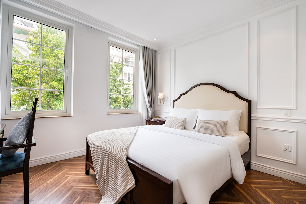 Denne boligen ligger i en frisk, trær-kledd gate i hjertet av Saigon, og skiller seg ut umiddelbart. Bygningen føles pent designet, og det rolige, grønne nabolaget holder alt kjølig og fredelig, mens ikoniske landemerker ligger bare noen skritt unna. Innvendig er suiten lys, elegant og fullstendig fornyet, med alle detaljer klare for et langt og komfortabelt opphold. Åpne gardinene, og byen sprer seg i en bred, vakker utsikt.