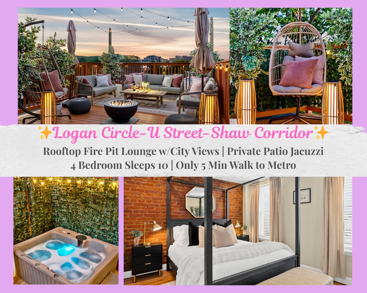💞💫 Fall in LOVE with DC vibes, starry nights & city sights! ✨ Logan Circle–U Street–Shaw Corridor Historic Luxury Row House | Sleeps 10 ✨ Enjoy a rooftop fire pit lounge with sunrise & sunset skyline views 🌆, private patio hot tub💦 & fast WiFi ✅. This 4BR/2.5BA historic row house is in a vibrant neighborhood to all restaurants & nightlife in central Logan Circle, U Street, Shaw & Metros all within walking distance-Giving you the best of all worlds!