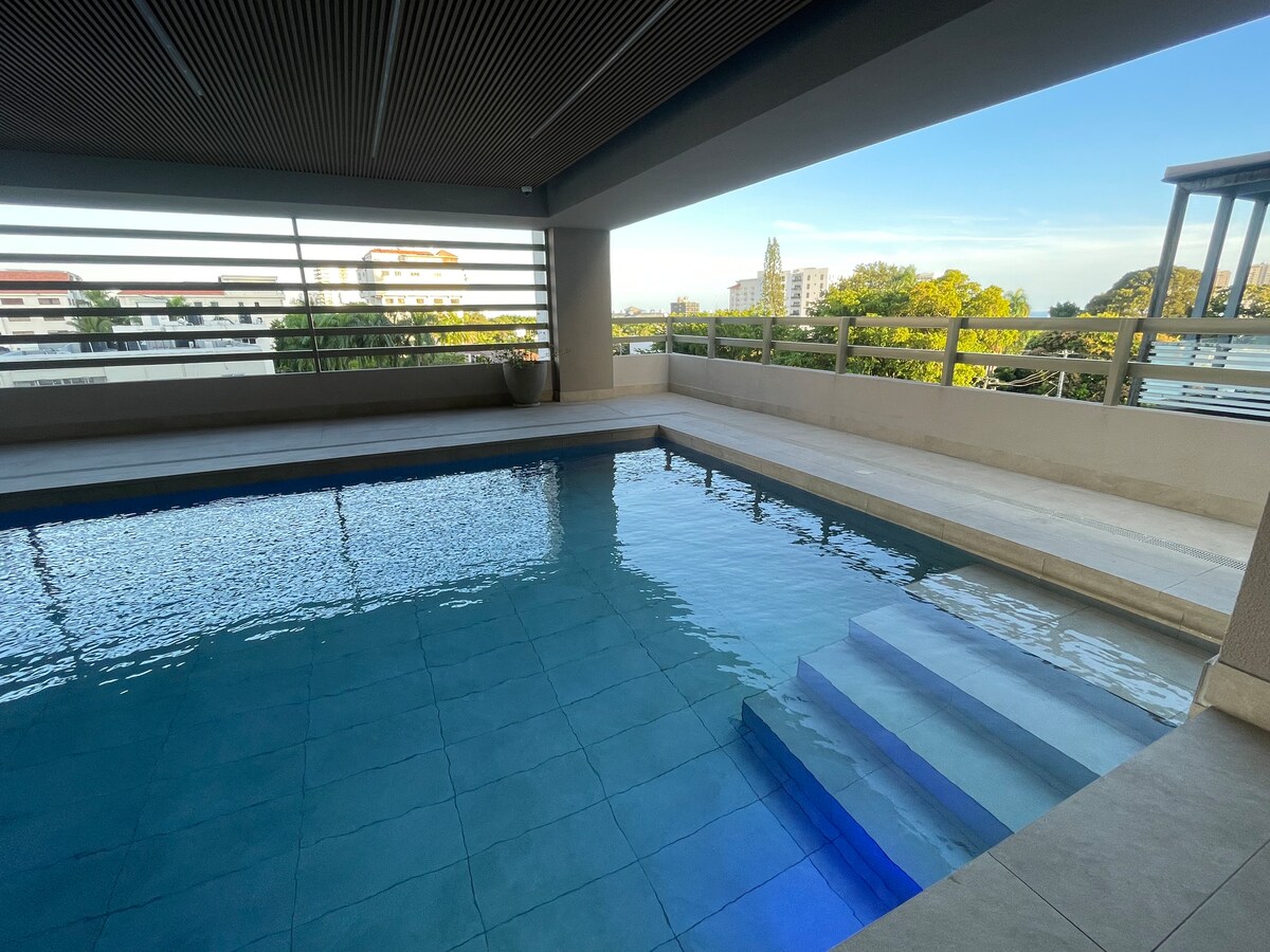 Opplev luksus i denne moderne leiligheten med to soverom i Piantini, Santo Domingos mest eksklusive område. Den er omgitt av de beste restaurantene, kjøpesentrene og underholdningen, og passer perfekt for forretningsreisende, par eller familier. Nyt et romslig, stilig oppholdsrom, en privat balkong med utsikt over byen og tilgang til et basseng på taket, treningsstudio og salongområder. Bygningen har døgnåpen resepsjon for en sømløs opplevelse.