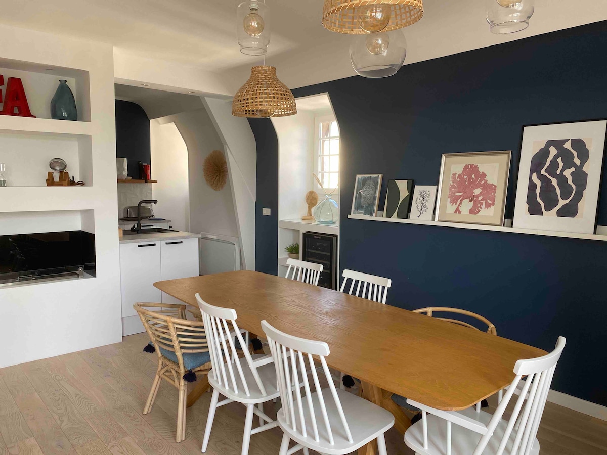 40 m fra stranden, klassifisert som 4-stjerners turistleilighet, denne flotte og store leiligheten på 110 m2 og dens tilstøtende studio på 20 m2 ligger i øverste etasje i en eksepsjonell bolig fra 1900. Renovert i en elegant strandstil, har de alle fasiliteter for å tilbringe en uforglemmelig tid med familien i en varm og munter atmosfære. Utsikten er fantastisk (hav, Gd Hotel) og du kan gå til alt. Merk: de ligger i 3. etasje uten heis.