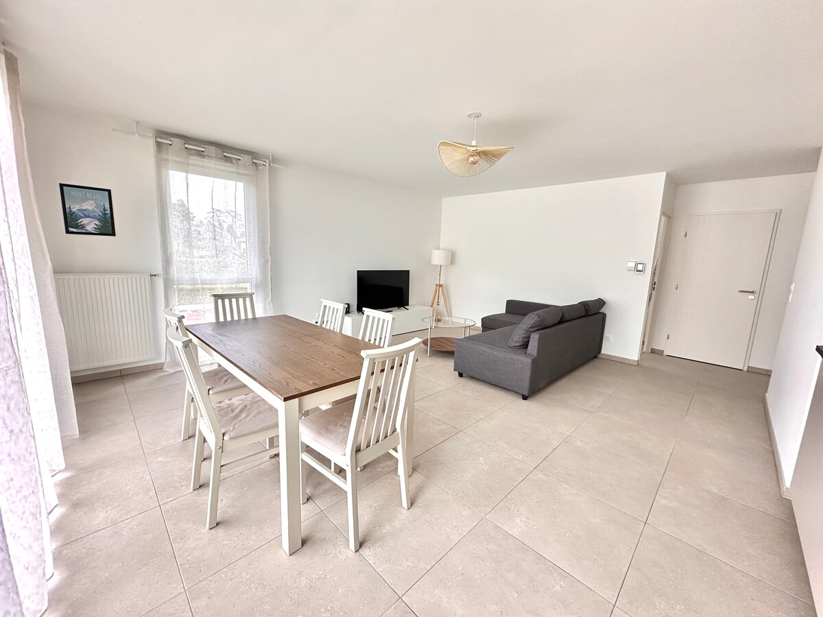 Velkommen til denne vakre nye leiligheten i Divonne-les-Bains, en kort spasertur fra den sveitsiske grensen. I første etasje tilbyr den rolige og komfortable omgivelser for et avslappende eller profesjonelt opphold. Du vil nyte et lyst opphold med et fullt utstyrt kjøkken, som åpner seg mot en hyggelig terrasse og en privat hage. To soverom, et moderne dusjrom og separat toalett kompletterer overnattingen. Privat parkering i lukket garasje. Perfekt beliggenhet for Genève, Genèvesjøen og Jura.
