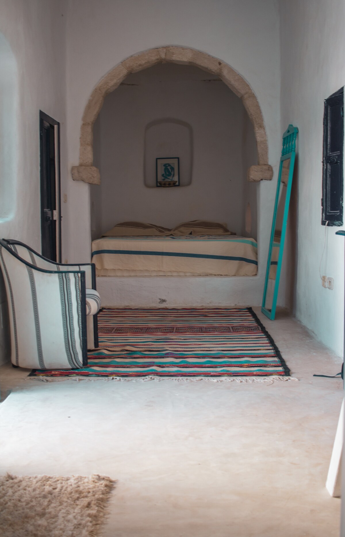 Denne enorme riaden, et tradisjonelt hus fra 1700-tallet, ligger i hjertet av Djerbahood, og har blitt totalrenovert med respekt for ånden i Djerbas folkelige arkitektur og dens arv. Det bioklimatiske habitatet og autentisiteten er nøye bevart. For å dekorere det blandet vi antikke møbler med moderne kunstverk, maghrebiske malerier… En blanding av tradisjon og modernisme, og hvor verk naturlig finner stedet sitt.