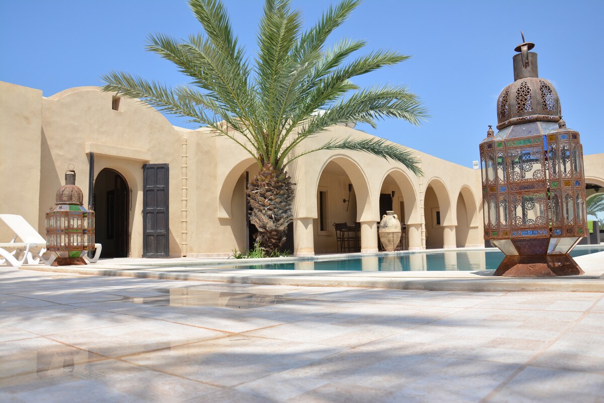 Vakker riad som ligger i ERRIADH DJERBA i hjertet av DJERBAHOOD, rom med klimaanlegg, TV og eget bad, svømmebasseng (7 m x 3,5 m), oppvarmet jacuzzi-basseng (3,3 m x 2,2 m), hage, overbygde terrasser, petanque-bane, biljardbord, alle trådløse fasiliteter, utstyrt sentralt kjøkken, klimaanlegg, amerikansk kjøleskap, stue med stor skjerm, grill under veranda osv.