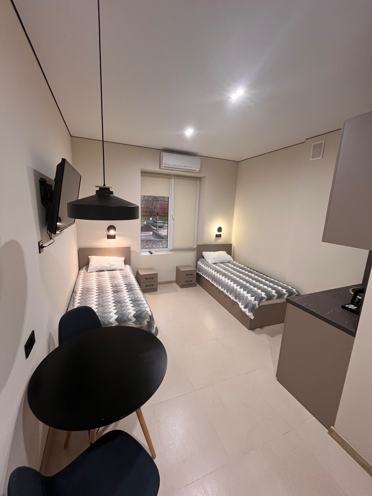Просторий світлий номер з легкими сірими відтінками. У центрі — королівське ліжко для розкішного відпочинку, а невелике віконце пропускає природне світло, створюючи затишок і умиротворення. В номері є все для комфортного проживання; простір наповнений світлом і спокоєм, ідеальний для відпочинку в укритті.