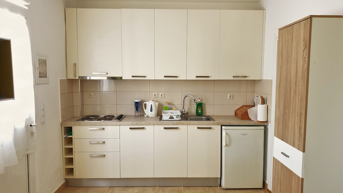 Leiligheten vår ligger i nærheten av Vourvoulos-stranden, fem minutter fra Fira sentrum, åtte minutter fra flyplassen og 15 minutter fra Oia (kjørerekkevidde). Den har et soverom med et lite tekjøkken (utstyrt med vask, vannkoker, kaffemaskin, elektrisk grill, mikrobølgeovn og kjøleskap) og et bad. Det er et uteområde med sjøutsikt, en minilekeplass, en grill og parkering. Det er ideelt for par som liker å slappe av og nyte naturen. Prisen inkluderer ikke offentlig skatt på 8 euro per natt.