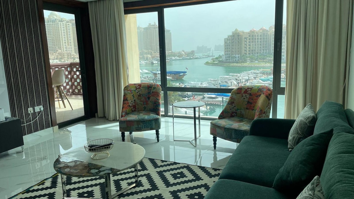 Elegant studio med utsikt – lev Pearl Life! Dette moderne studioet tilbyr et koselig, godt designet sted med fantastisk utsikt over marinaen, og alt du trenger for et avslappende opphold - perfekt for enslige reisende eller par som ønsker å slappe av i et av Dohas mest luksuriøse nabolag.