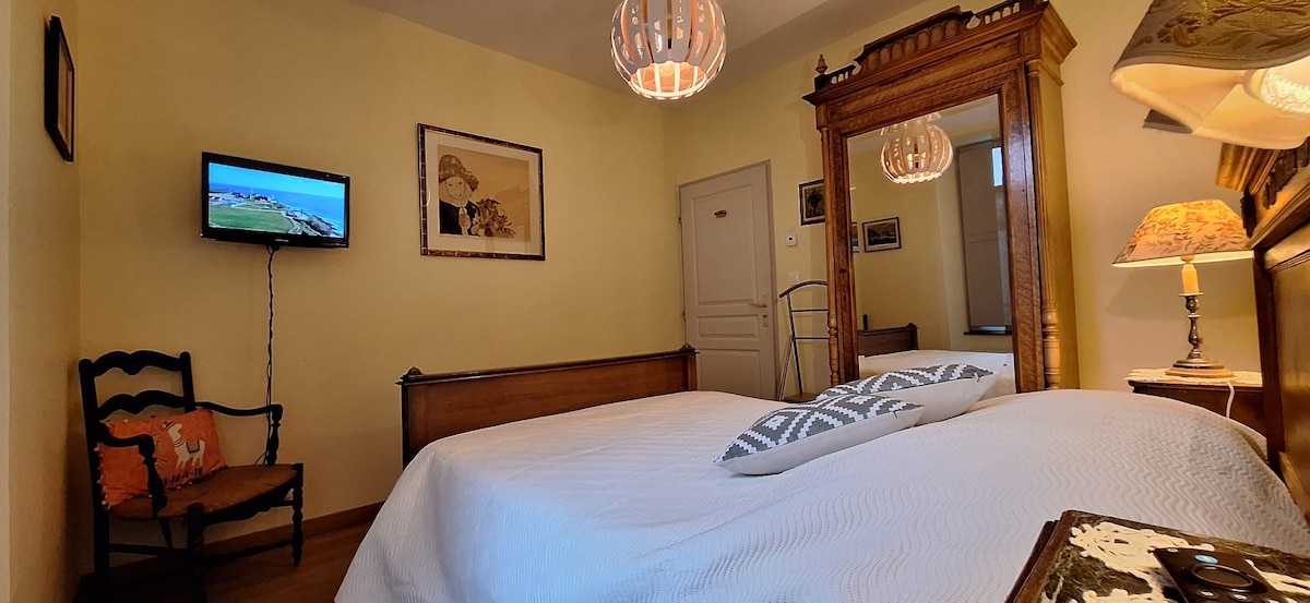 Rolig og romslig leilighet på 120 m². I byen, 5 minutters gange fra sentrum Komfortabel med kvalitetssengetøy størrelse 180x200. Seks senger med to soverom og en sovesofa 140x190. - 1. soverom: dobbeltseng - 2. soverom: to enkeltsenger eller en dobbeltseng Parkering ved foten av boligen med 2 private plasser. Tilgang til en garasje med "mini service-stasjon" med elektrisk ladestasjon (gratis den første dagen, deretter 10 € / natt) Dekkpumpe og støvsuger.