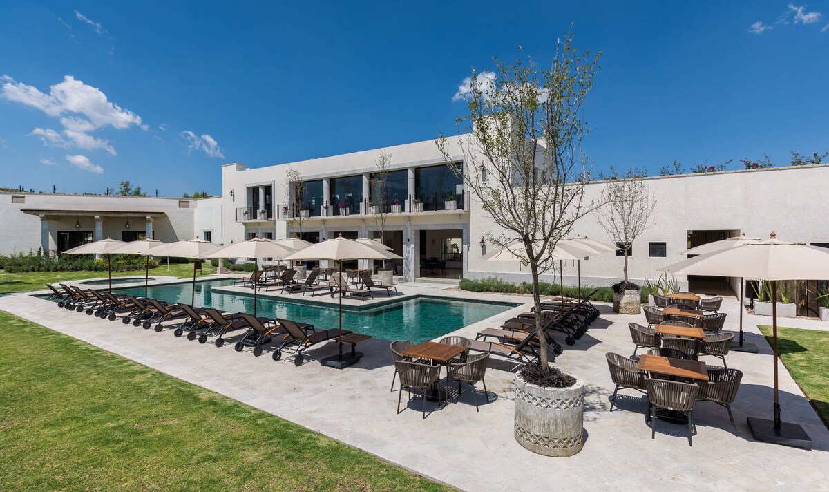 Nyt oppholdet ditt på Villa La Luz, som ligger i det splitter nye boligområdet «La Luminaria». San Miguel de Allende ligger rett utenfor døren din, bare 20 minutters gange fra den berømte Parroquia og alle restaurantene, galleriene og shoppingmulighetene byen har å by på. Hjemmet er stilig, komfortabelt og romslig med to soverom og to bad. Nyt innendørs-/utendørsstilen som bringer inn de frodige grønne hagene fra din private terrasse. Nyt fasiliteter i feriestedstil på luksuriøse «La Luminaria».