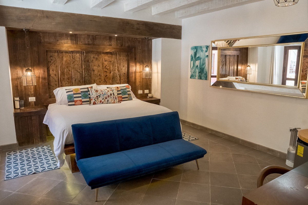 Rommet «Rosa» tilbyr en romantisk og sjarmerende atmosfære, med en kingsize-seng og et privat bad. Veggene i rosa og de rustikke meksikanske møblene skaper en varm og imøtekommende atmosfære, perfekt for par eller reisende som leter etter et intimt sted.