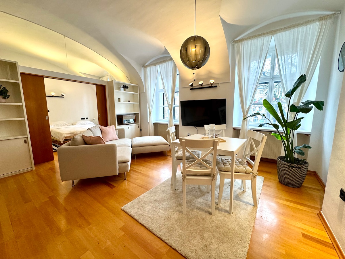 Denne koselige, lyse leiligheten med ett soverom ble totalrenovert og fullt utstyrt. Det har høyt tak og er veldig åpent og lyst. ▶ Ligger i en 100 år gammel historisk bygning, like ved siden av Ljubljanas grønne oase - parken Tivoli (fem minutters gange) hvor du kan nyte en piknik, jogge eller på en enkel tur til Roznik-bakken. ▶ Sentrum ligger 20 minutter unna (Preseren 's Square), men for en spasertur det er; rett over den vakre parken Tivoli. ▶ Den nærmeste bussholdeplassen ligger tre minutter unna.
