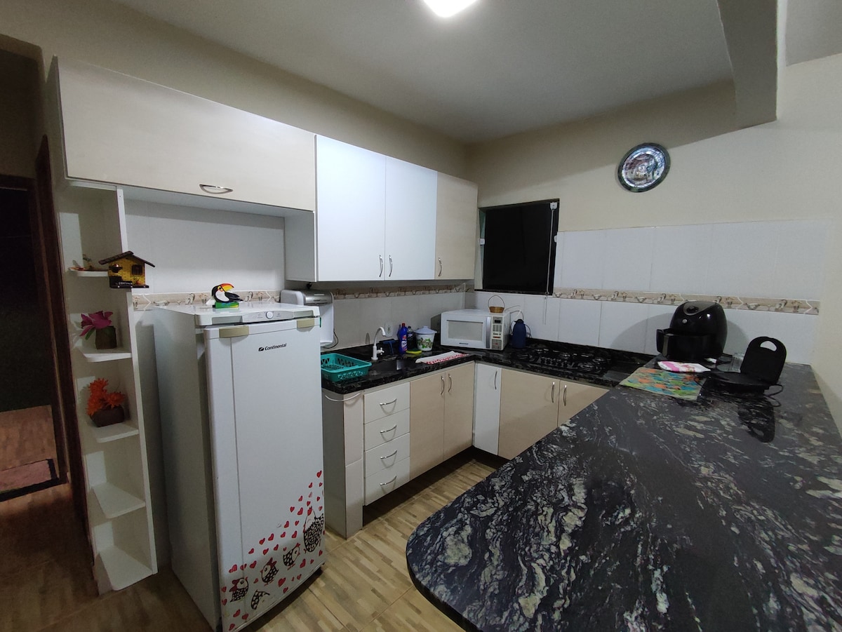 Sted med peis og komplett kjøkken. Dette ligger midt i naturen, men like ved hovedveien. Vær oppmerksom på at det er 1,5 km grusvei ved ankomst. Vi tilbyr alt sengetøy og håndklær. 9 km fra Domingos Martins sentrum. Kom og slapp av og drikk en vin i det kjølige fjellklimaet. Eiendommen er for mennesker som liker naturen. Fra utekjøkkenet kan du se aper, fugler som tukaner osv. Vi tilbyr rabatter for langvarige opphold. Eiendommen ligger i det landlige DM-området.