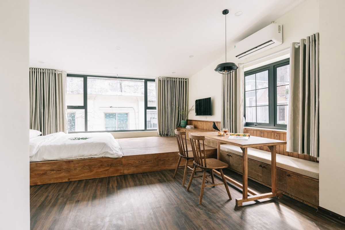 Denne koselige, rene og romslige studioleiligheten er 30 kvm med ett soverom, ett lite kjøkken, ett arbeidsområde for bærbar PC og ett tilknyttet privat bad, som ligger i en liten bakgate, bare 50 meter til hovedveien. Den har to store vinduer, slik at rommene er naturlig lyse og luftige. Studioet er et ideelt valg for grupper på 1–2 personer. Den ligger sentralt til i et lokalt nabolag, veldig nærme store innsjøer, parker, bussholdeplasser, supermarkeder, restauranter osv., og spesielt bare tre km fra Hanoj gamleby.