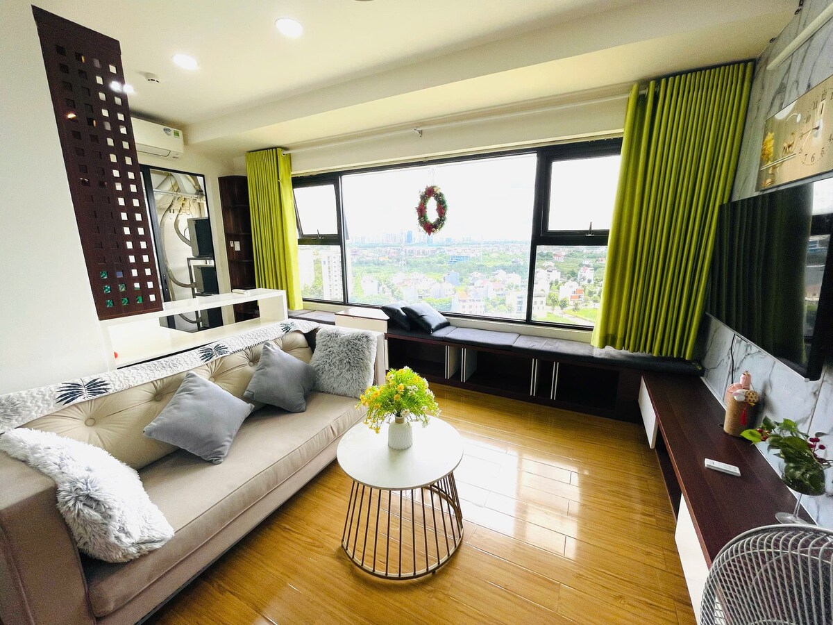 Dette toppleiligheten på 180 kvm ligger i Centana-distriktet 2 Ho Chi Minh Funksjonene, fasilitetene og fasilitetene som du vil motta i løpet av leieperioden Stor sofa Cotton Silke sengetøy Kjøkken fullt utstyrt med vaskemaskin , elektrisk komfyr, mikrobølgeovn, kjøleskap, riskoker, kjøkkenredskaper Elektroniske enheter: Smart-TV, moderne luksuspult, skap, glasshyller.