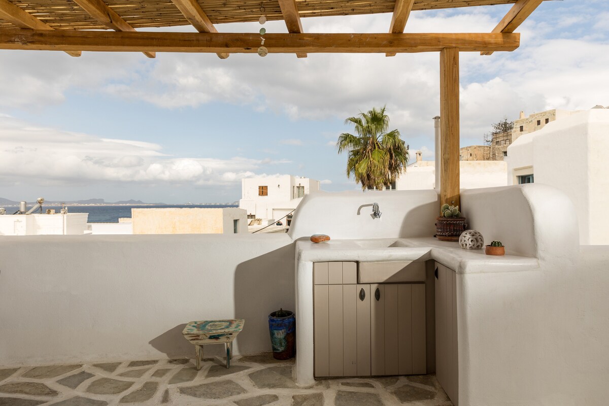 Toetasjes leilighet i hjertet av Old Market, det eldste tradisjonelle området i Naxos by (Chora). Bygget og pusset opp med total respekt for den klassiske Kykladiske arkitekturen. Tre møter stein, og de håndlagde veggene gir en helt annen følelse. Ett skritt fra havnen, transportmidler, restaurant og barer gjør leiligheten til det beste stedet for folk som ønsker ferie i sentrum av Naxos by!