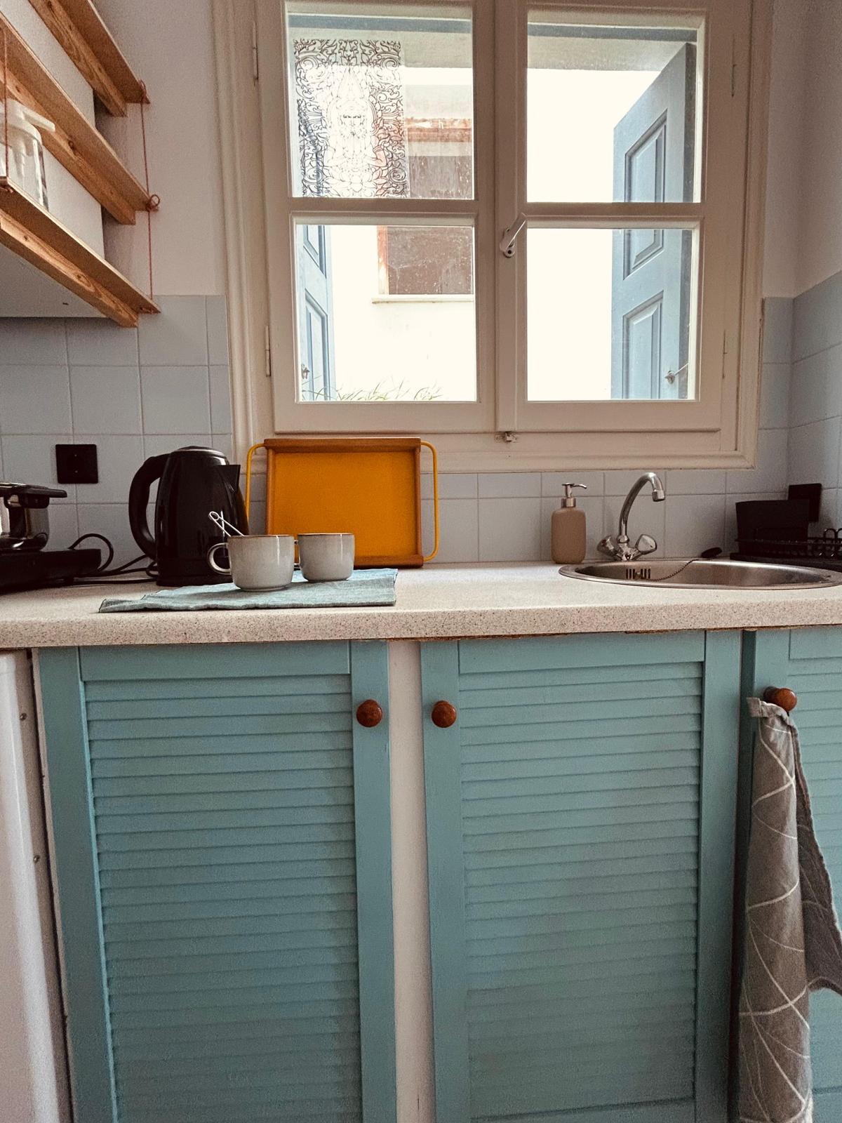 Enestående tradisjonelle greske øyleiligheter med 360-graders utsikt over havet ved solnedgang, tre minutters gange fra hovedstranden på øya, i nærheten av restauranter. Ideelt for par. Ett soverom, innebygd kjøkken fullt utstyrt med moderne utstyr. Det understrekes at leiligheten er helt autonom (egen inngang og overbygd balkong, ingen fellesområder og fasiliteter). Det er ingen risiko for COVID-infeksjon, og streng rengjøring og desinfeksjon utføres etter utsjekking.