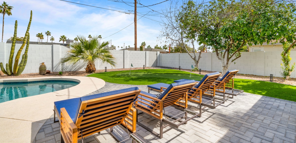 Slapp av med stil på dette luksuriøse Airbnb-hjemmet i Scottsdale med privat basseng, bare noen minutter fra gamlebyen. Dette moderne tilfluktsstedet er perfekt for familier, og tilbyr eksklusive fasiliteter, romslig boenhet og fredelige uteområder. Nyt godt av topprangerte restauranter, shopping, golf og uteliv i nærheten. Sentralt plassert, familievennlig og designet for komfort – din perfekte ørkenferie med bassengvibber venter.