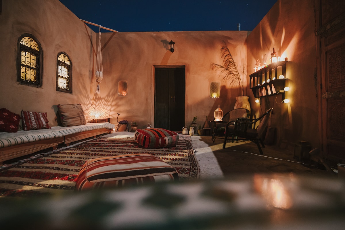 Etter suksessen til The Dune House på Airbnb, har vi lagt til et separat rom i studio-stil! Vakkert rustikk, med utsikt fra alle vinduer og en privat balkong. Det finnes ingen andre steder som dette. For et helt unikt opphold og autentisk ørken-gjestfrihet, er vi stolte av å ønske deg velkommen til vårt favorittrom i den marokkanske ørkenen. Med tilgang til hovedterrassen til Dune House, og bassenget til hotellet vårt 200 meter unna, tilbyr dette rommet en egen inngang til huset.