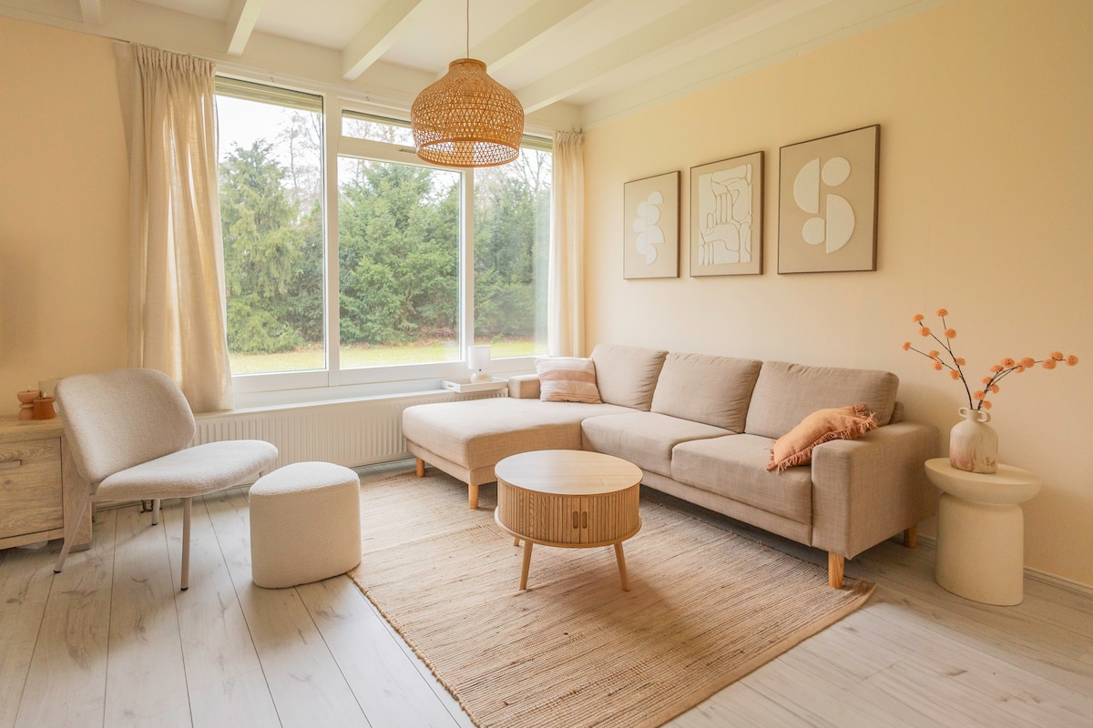 Dette komfortable feriehuset ligger rett ved Drents-Friese Wold. Huset er en park uten innganger/inngangsport eller regler. Husene i parken er både permanent bebodde og leid ut til ferie. Du kan gå turer, sykle og terrengsykling i området. Byer som Assen, Leeuwarden og Groningen er lett tilgjengelige. Huset er fullt og stilig innredet og inviterer deg til å slappe av med en bok ved peisen.