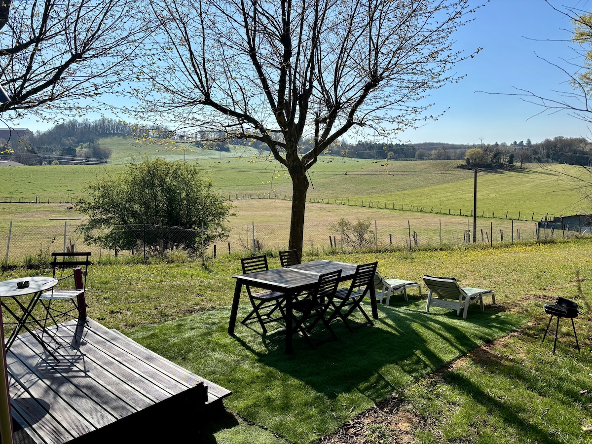 50 m2 rolig hytte i et boligområde. Består av et utstyrt kjøkken (servise, kjøkkenutstyr, ovn, mikrobølgeovn, gasskomfyr, brødrister ...). Et bad med dusj og toalett. En stor stue med sofa, TV (DTT), en himmelsseng (140/190), en peisovn. En privat utplass med utsikt over Løvens klippe, hagemøbler, mulighet for grill. Parkering og privat inngang. 10 minutters gange fra sentrum.