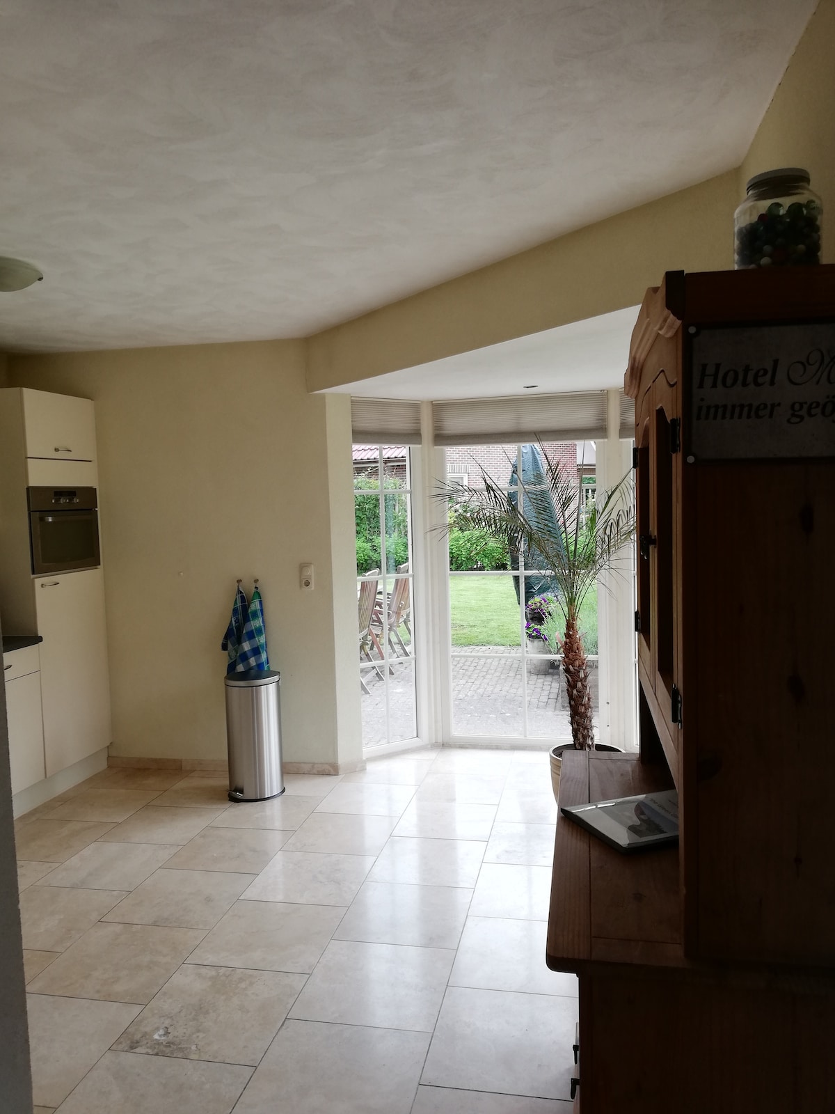 I første etasje er det en romslig stue med utsikt over hagen. Fra sittegruppen kan du nyte den grønne utsikten. Du kan få et inntrykk av huset via videoen på YouTube. Søk etter 'Lovely house on the water'. Hvis du liker å fiske, kan du prøve å fange en fisk fra hagen. Barn kan leke i sandkassen, på minisklien eller på klatrepinnen. Hagen kan lukkes med et gjerde, og det er en avsperring ved vannet, slik at barna kan leke trygt.
