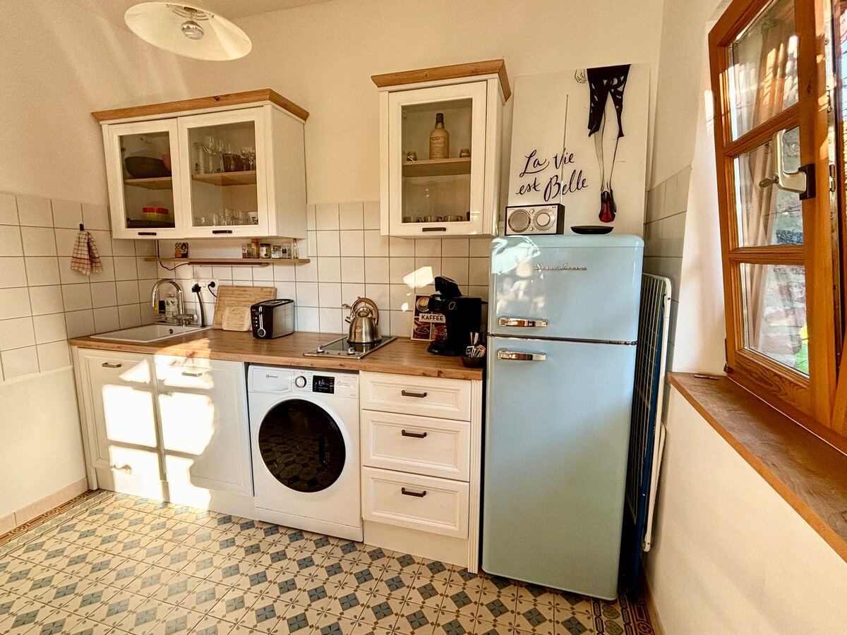 OASE i den grønne bakgården, første etasje, ro, terrasse, carport, gratis PayTV, kaffe og te, sykler tilbyr gjestene en terrasse, utsikt over hagen, et sitteområde, en flatskjerm-TV med satellittkanaler, et fullt utstyrt kjøkken med kjøleskap og oppvaskmaskin, og et eget bad med dusj og gratis toalettartikler. Det er stekeovn, mikrobølgeovn og komfyr, samt kaffemaskin og vannkoker.