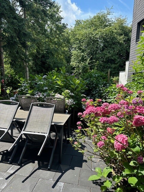 Vår hageleilighet ligger i kjelleretasjen i et jugendstilshus fra 1906. Du har tilgang til to rom med totalt 90 kvm. En stue, et soverom og et kjøkken. Alle vinduer og den solfylte terrassen har utsikt over hagen. Biblioteket vårt inviterer deg til å lese. Nyt avslappet og romslig boende i en rolig beliggenhet i sentrum av Düsseldorf. Det store shakerbordet kan også brukes til møter med opptil 6 personer.