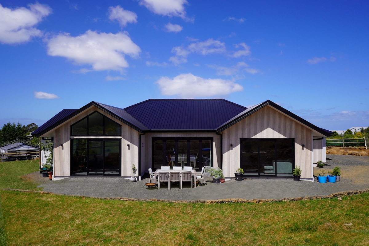 Velkommen til vårt lille paradis. Et vakkert, moderne hus på toppen av bakken med spektakulær 180 graders utsikt over havet. I landlige omgivelser er det det perfekte stedet for en avslappende tid. Stue og kjøkken med åpen planløsning. Store skyvedører åpner huset når været er bra. 25 minutter fra Dunedin på den naturskjønne ruten. Surfing og badestrender i nærheten. Kjæledyr etter forhandling.