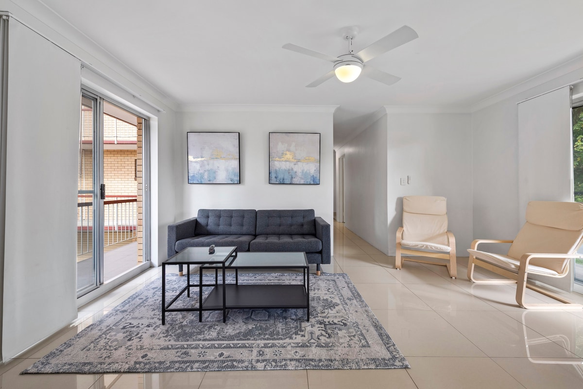 Romslig 3BRM-leilighet i nærheten av Gabba med gratis parkering og trådløst nettverk.
