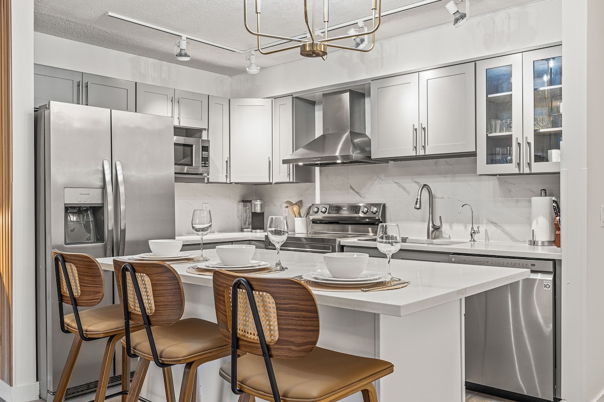 Ingen festhus! En kort spasertur unna ligger Stampede Grounds, BMO Centre, Victoria Park C-Train Station, Cowboys Casino og Scotiabank Saddledome, samt alle butikkene, pubene og bryggeriene som 17th Ave og DT Calgary har å tilby. Denne lyse og romslige leiligheten med to soverom tilbyr alle fasilitetene du trenger under ferien eller det korte oppholdet ditt i Calgary – perfekt for par, små familier eller vennegjenger. Vi er i nærheten av all action, og det beste Calgary har å tilby!