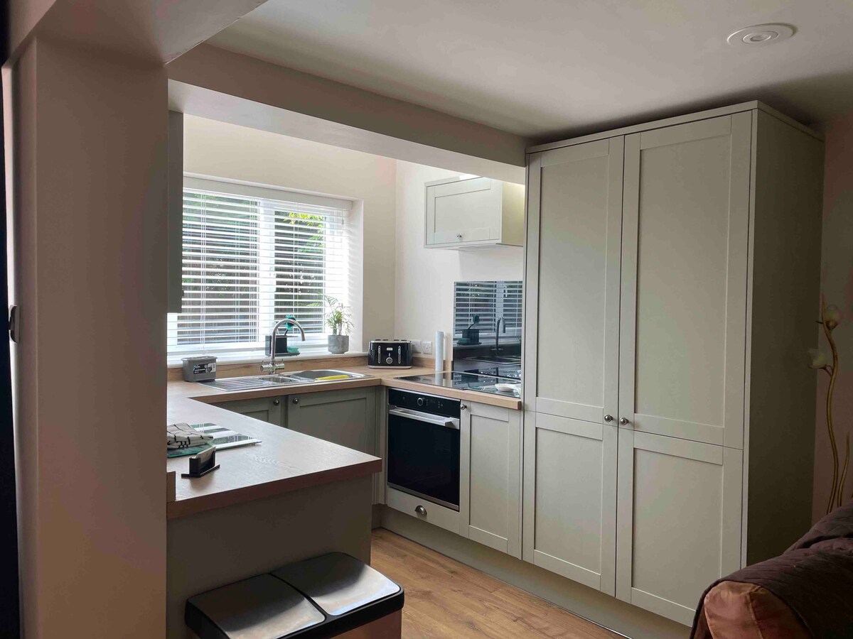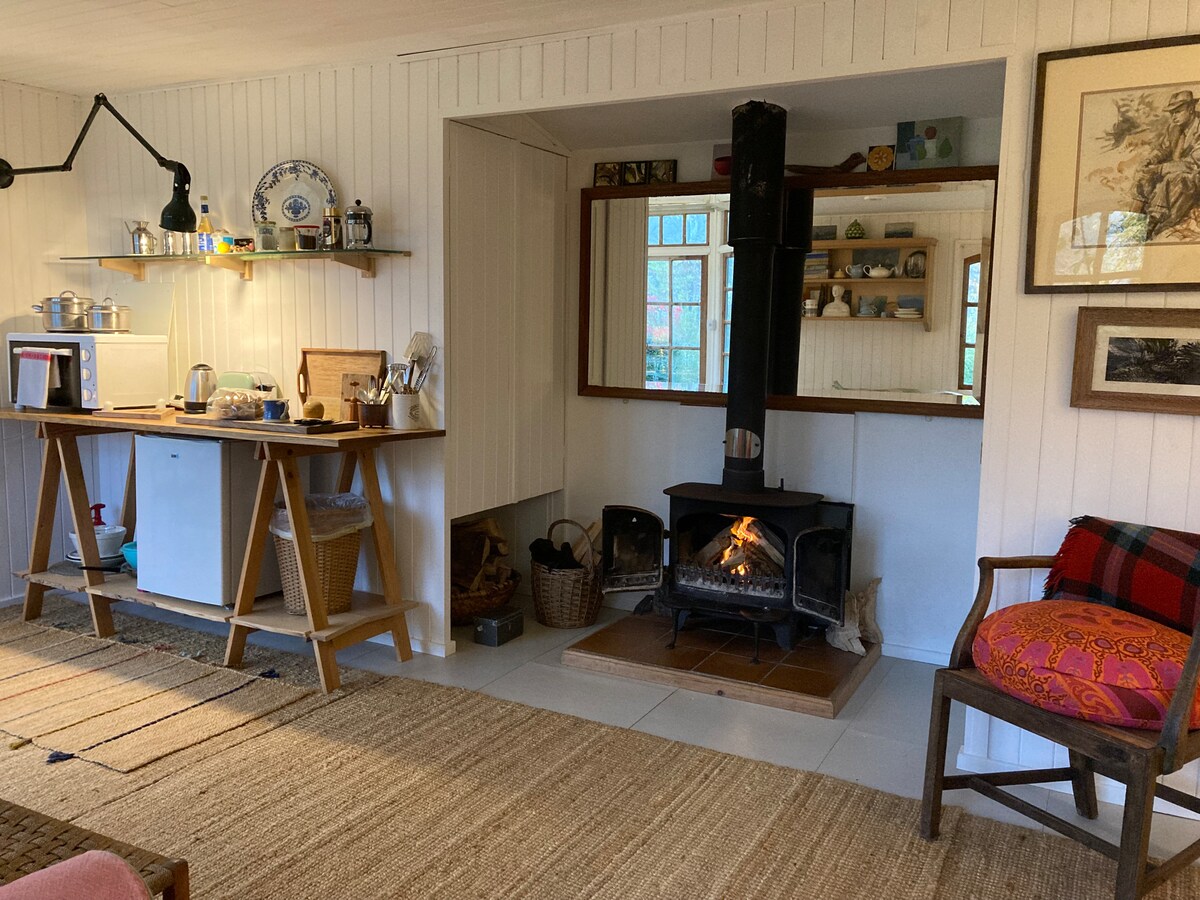 En nydelig studioleilighet i sedertre med privatliv i en vakker hage full av fuglesang og utsikt over Pentridge-fjellet. Studioleiligheten har en veldig komfortabel dobbeltseng, en sofa og vedovn for varme og hygge. Det er et ovalt bord å sitte, spise eller jobbe ved, omgitt av vinduer som slipper sollyset inn. Kjøkkenet har en liten komfyr og kjøleskap og det grunnleggende for enkel god matlaging. Badet har dusj med rikelig med varmt vann.