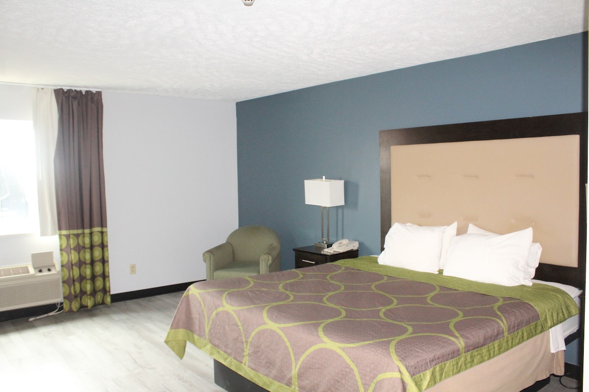 Jefferson-rommet er et sjarmerende, unikt sted med utsikt over sentrum av Chillicothe. Dette rommet har en kingsize-seng og et fullt ADA-bad. Det ligger på det nedre nivået med null inngangstilgang hvis ønskelig. Heisen kan brukes til å reise mellom etasjer. Nyt oppholdet ditt i dette unike ombygde Carnegie-biblioteket, som ble bygget i 1915. Carnegie ligger innenfor gangavstand fra kaffebarer, restauranter, parker, kino, Illinois-elven og lokale butikker.
