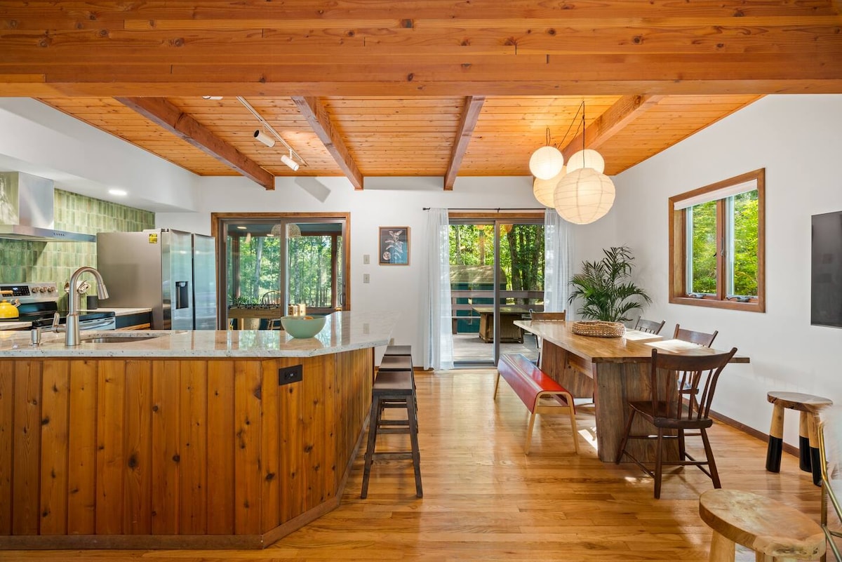 Welcome to picturesque spacious luxury: this fully renovated cabin, tucked away on an expansive 200+ acre property w/ private trails. The spectacular 1 bedroom features: vaulted ceilings, brand new kitchen/appliances, granite counter island w/seating, dining room, powder room & bathroom with walk in shower & soaking bathtub, King bed, blackout curtains, large windows w/ nature views, Smart TV, BBQ, hot tub option(available in May) & direct access to the serene forest & walking paths.