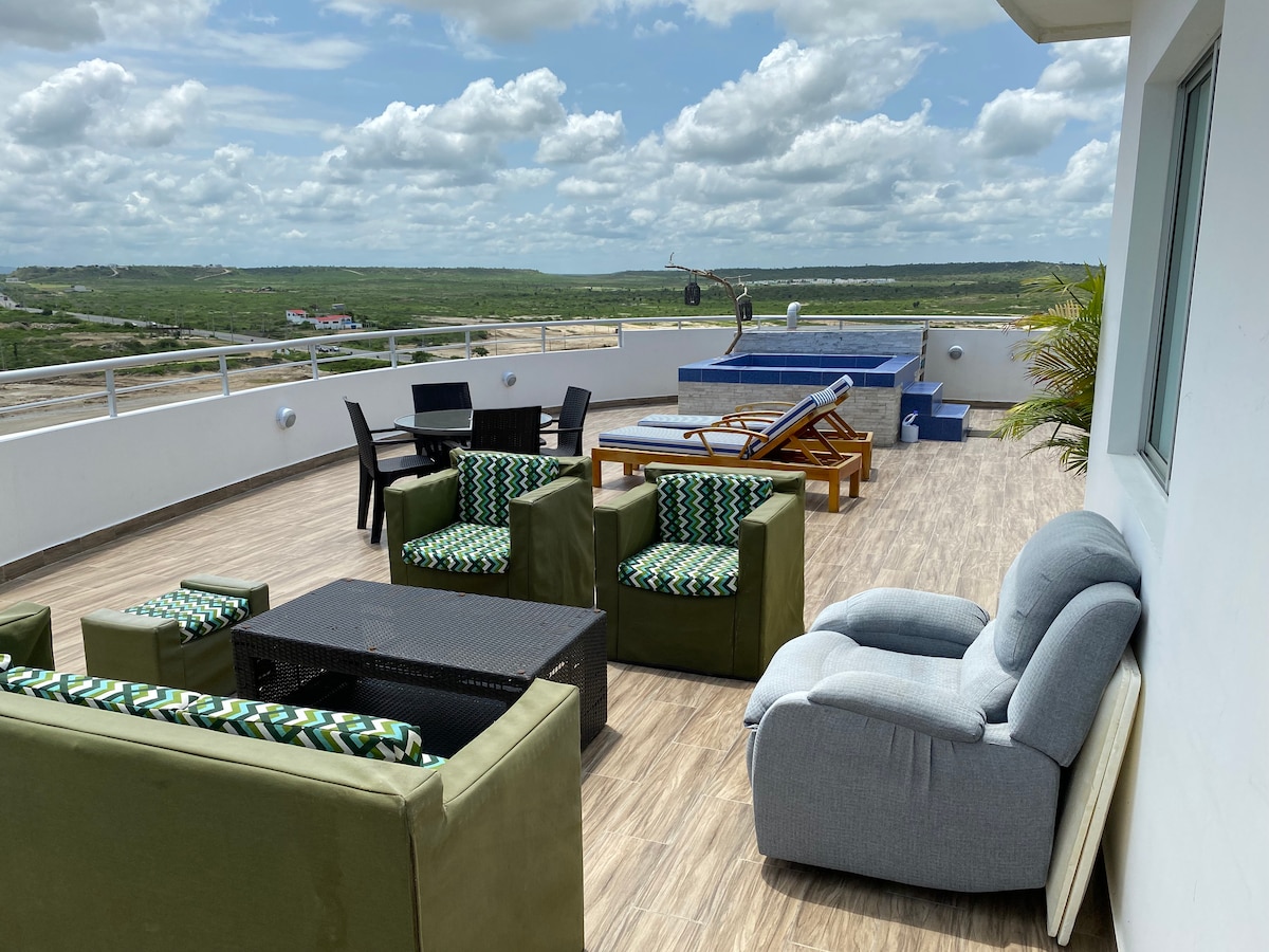 Privat suite på terrasse, 5-etasjes bygning i Punta Blanca. Den har et stort soverom med en queensize-seng og to enkeltsenger, for maksimalt fire personer, et stort bad, et skap, et utstyrt amerikansk kjøkken: induksjonsjern, kjøleskap, mikrobølgeovn, riskoker, blender, kaffetrakter og oppvask. Stue, spisestue, stor terrasse med to rom, jacuzzi og omfattende havutsikt, ideell for par, familier og venner. Sunt miljø. Ideelt for å se: soloppgang, solnedgang, hvalsafari og avslapning.
