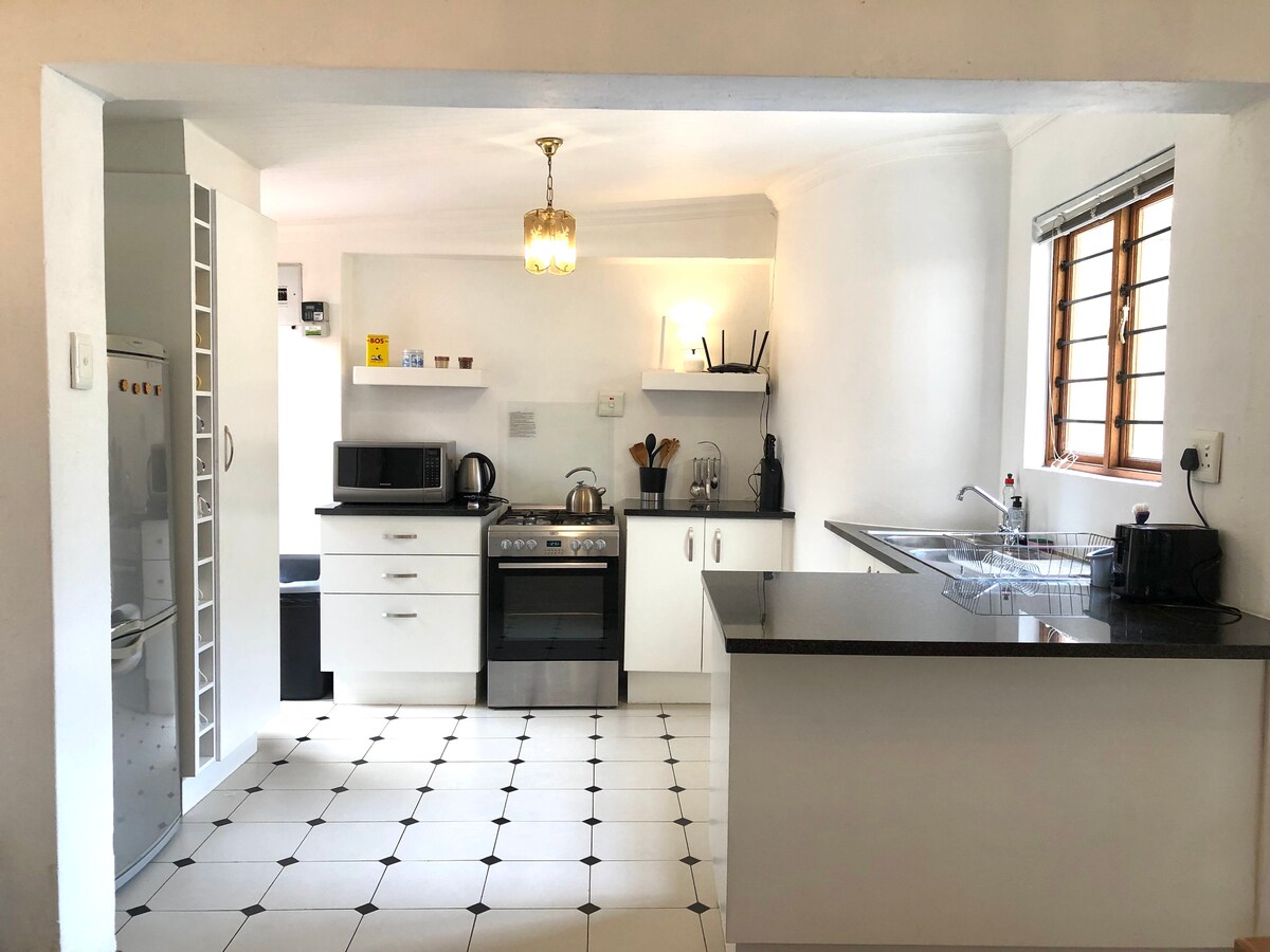 Vakkert, fullt utstyrt hagehus i tre i et fredelig område, nær Oliver Tambo lufthavn. Nyt selskapet til fuglene mens du slapper av og slapper av på ditt eget private sted. Ubegrenset internett (200 M/s synkronisering) med trådløst nettverk er tilgjengelig. Delt tilgang til svømmebasseng. Apple TV med Netflix i salongen og hovedsoverommet. En kontinental frokost med selvbetjening vil bli gitt. Ditt eget private grillområde. Vi har solenergi og vanntanker. Det er en hagedusj.