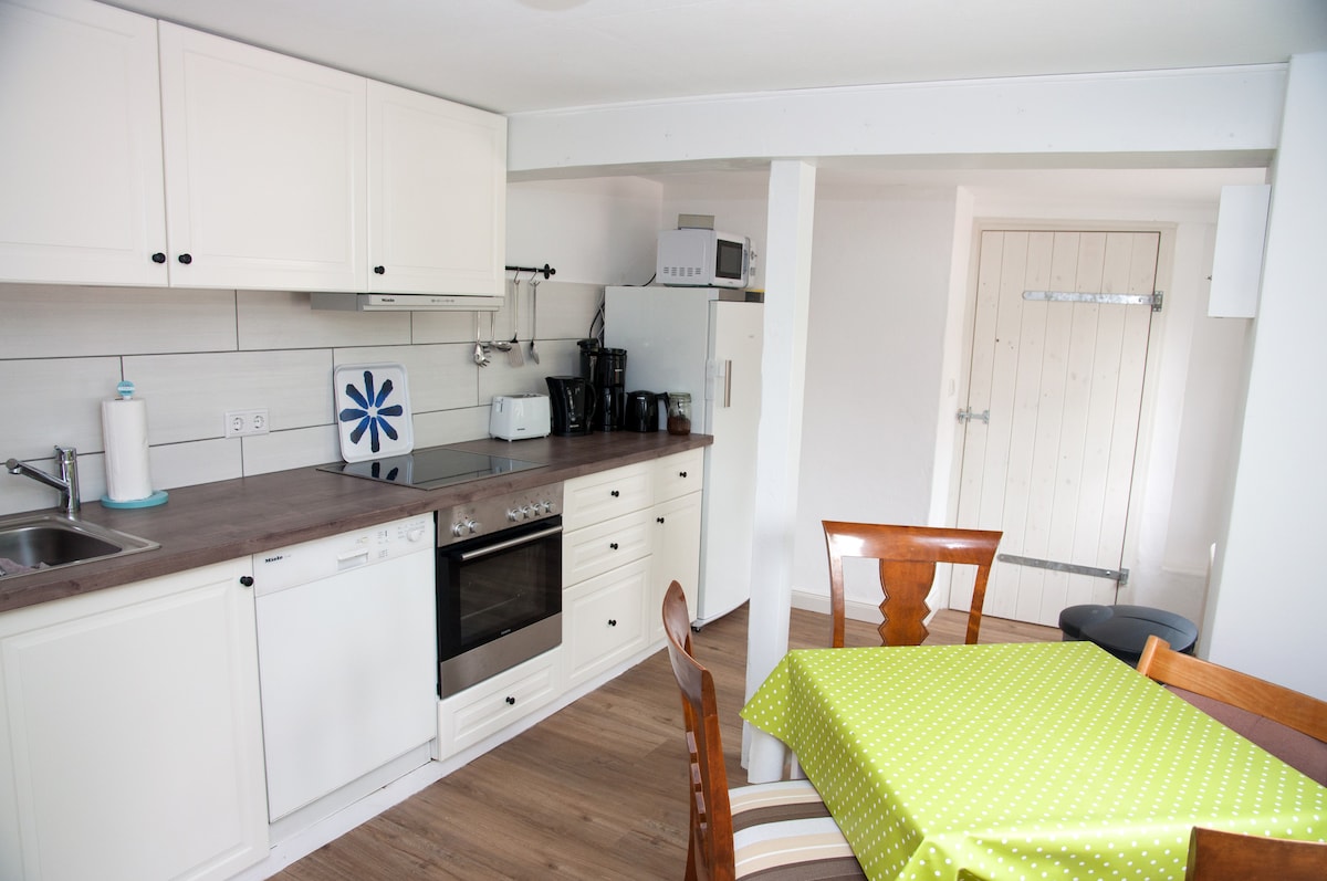 Ha en flott ferie med oss! Du bor i en historisk gårdsbygning med alle fasilitetene. Masse plass inne i huset, på lekeplassen med teaterscene eller utenfor i den parkliknende hagen gir deg mange muligheter for en avslappende ferie i ethvert vær. Hvis du vil, kan du besøke oss på gården vår med melkeproduksjon. Gården vår er ca. 300 m unna og kan enkelt nås via en gangvei.