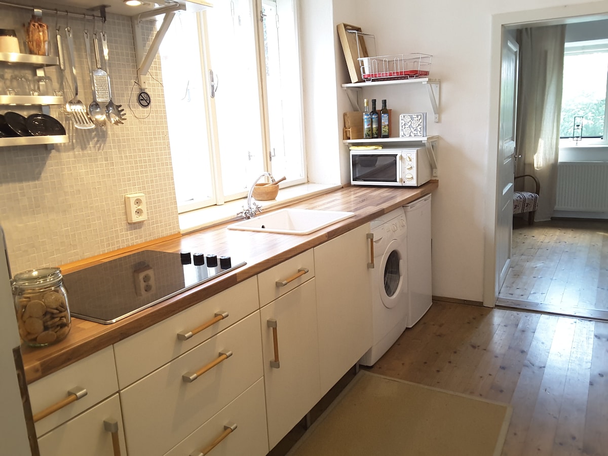 Du leier en bestemorleilighet som passer for én til seks personer, som en separat del av et familiehus. Det er mye utstyr, rolige omgivelser og det ligger i nærheten av sentrum. Hage/terrasse kan brukes (solsenger, volleyball, badminton, bordtennis, husker, svingstang osv.). Rommene er store og har god (oppbevarings)plass. Det er tre queensize-senger: en seng og en sovesofa med madrasser for enda mer komfort på soverommet, og en annen sovesofa kan brukes i stuen.