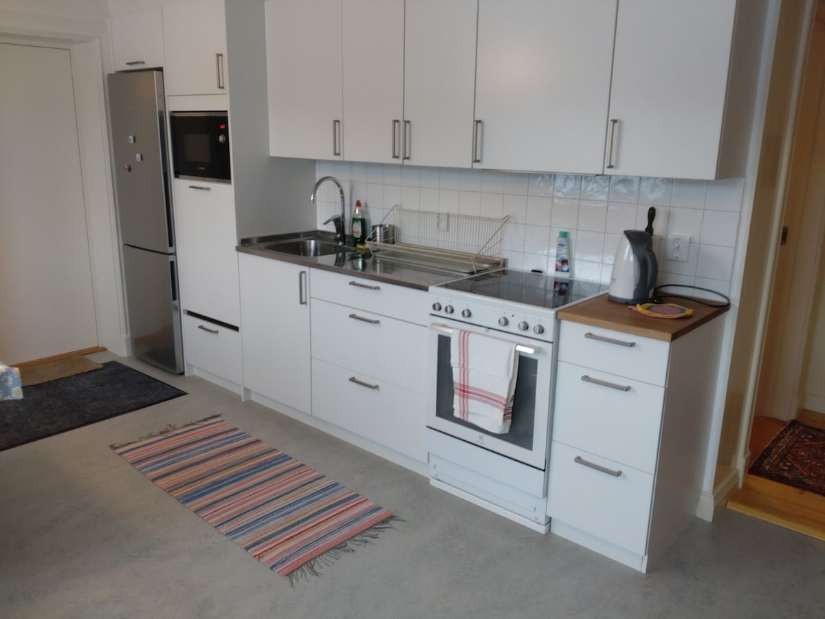 Nybygd (2023) eiendom med tre separate leiligheter med alle fasiliteter. Bolig i sørlig beliggenhet med fantastisk utsikt over Mälaren. I nærheten av buss og Stockholm sentrum. Dagligvarebutikk innenfor sykkelavstand. Leilighet med ett soverom, bad og kjøkken (totalt 32 m2). Egen terrasse med kveldssol. På soverommet er det én dobbeltseng (140 cm bred), og på kjøkkenet én køyeseng med to senger (for personer som ikke er høyere enn 175 cm). Kjøkken med kjøleskap, fryser, oppvaskmaskin, mikrobølgeovn og komfyr med induksjonstopp og ovn. Gulvvarme og peis.