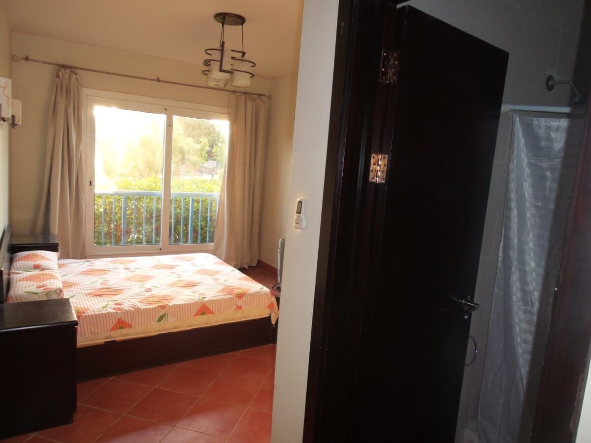 Hotellhytte i Porto Marina Golf, første etasje med privat hage, med utsikt over to svømmebassenger, to rom med aircondition, inkludert et master-rom med privat bad, en resepsjon med aircondition, et bad i resepsjonen og et fullt kjøkken med alle apparater...... For bestilling / 00201027500066 00201278415077