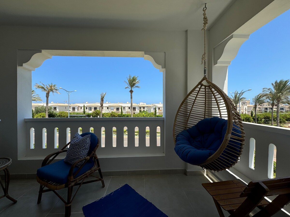 Hyggelig Mykonos-inspirert opphold i gresk landsby, Marassi – Al Alamein En sjarmerende og komfortabel leilighet i den fredelige greske landsbyen Marassi, vakkert designet med Mykonos-stil for en avslappende og uforglemmelig ferie ved kysten. Det er det perfekte feriestedet for de som setter pris på rolig luksus, myk eleganse og gjennomtenkte detaljer – og tilbyr de høyeste nivåene av komfort, avslapning og en hyggelig atmosfære.