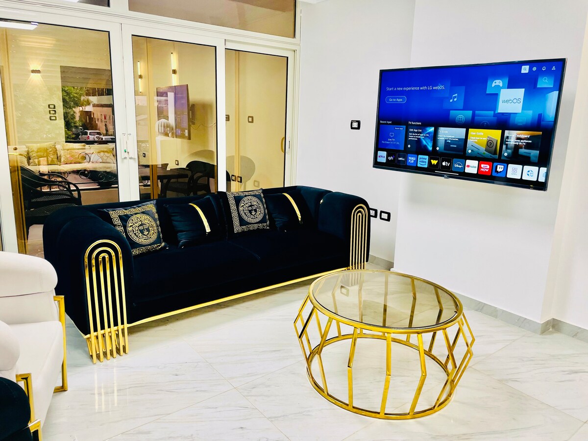 Nyt et luksuriøst opphold i en leilighet med to soverom med hotellfinish, på et av de beste stedene i Nasr City, rett ved siden av City Stars Mall. Leiligheten er møblert med elegante og moderne møbler, og inkluderer: Fullt utstyrt kjøkken med alt du trenger (kjøleskap, mikrobølgeovn, vannkoker, luftfrityr). Strykejern og strykebrett for å gjøre oppholdet ditt komfortabelt og komplett. En romslig og lys stue for hvile og avslapning. Høyhastighetsinternett og sentralt klimaanlegg Beliggenheten er veldig spesiell, bare noen skritt fra restauranter, kafeer, kjøpesentre og enkel tilgang til flyplassen Perfekt for familier eller forretningsfolk som ønsker komfort og luksus.