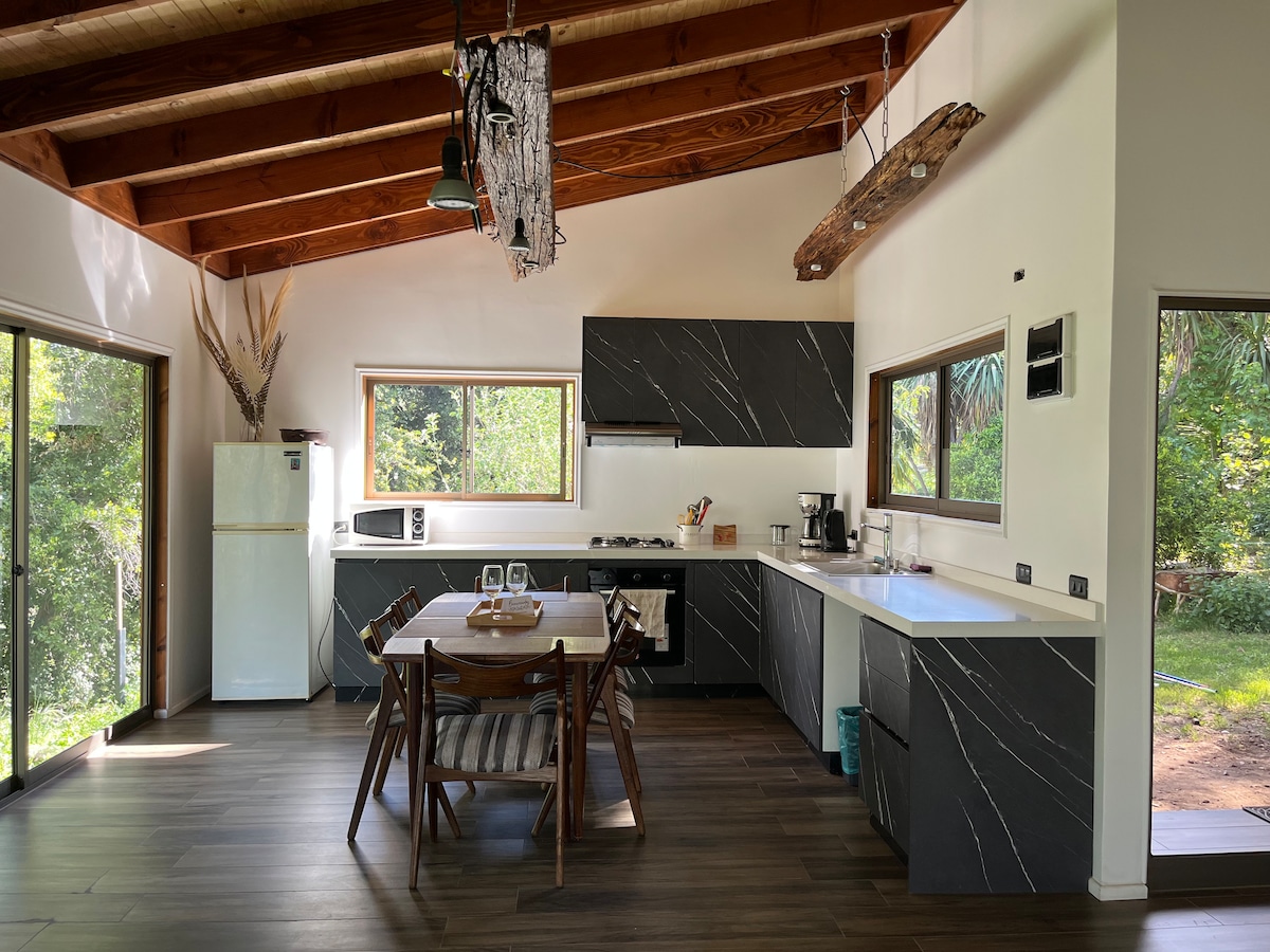Ideelt sted å slappe av med energien fra fjellkjeden. Hytte med attraktivt naturlig design, som ligger ved foten av Cerro Lican og ved bredden av San José-elvemunningen, 10 minutter fra byen San José de Maipo. Den har en terrasse under et pergola og et annet sted med grill. Svømmebasseng med elvevann (ikke gjennomsiktig). Et dobbeltsoverom, et soverom med skrivebord, et bad og en loftsleilighet med en futon. Ideelt for par som ønsker å oppleve stillhet og ro i naturen.