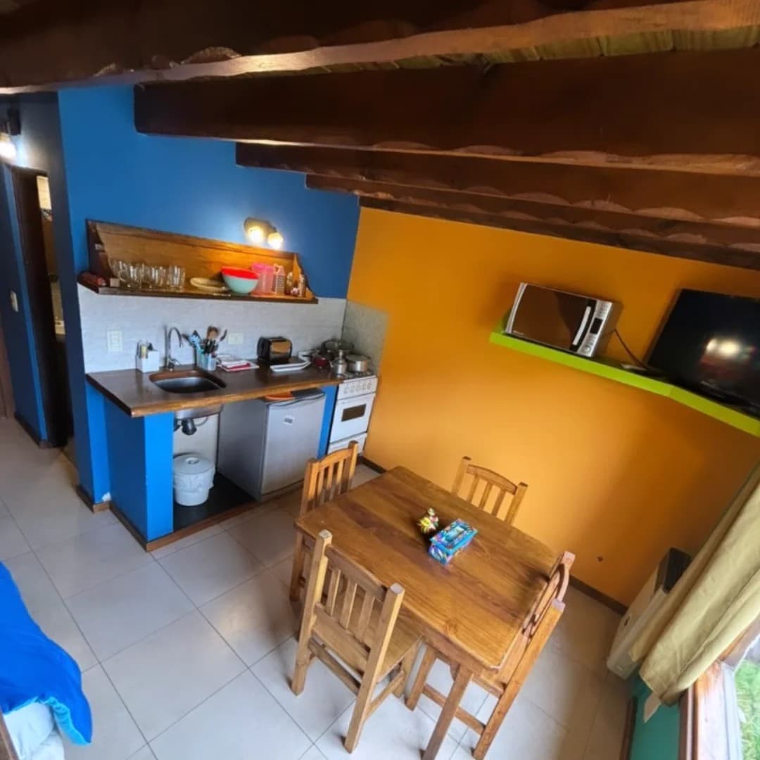 El departamento ubicado a pasos de la Av. principal y de las sendas de este encantador pueblo; cuenta dos ambientes; una luminosa sala de estar y comedor integrados a una cocina completamente equipada con cocina vitroceramica, microondas, heladera, tostadora, pava eléctrica, utensilios y hermosa vajilla. Dispone de una elegante barra central de madera, sillones y una recepción. Y ofrece una habitación independiente con opción de una cama doble o dos camas individuales con smart TV! Inolvidable!