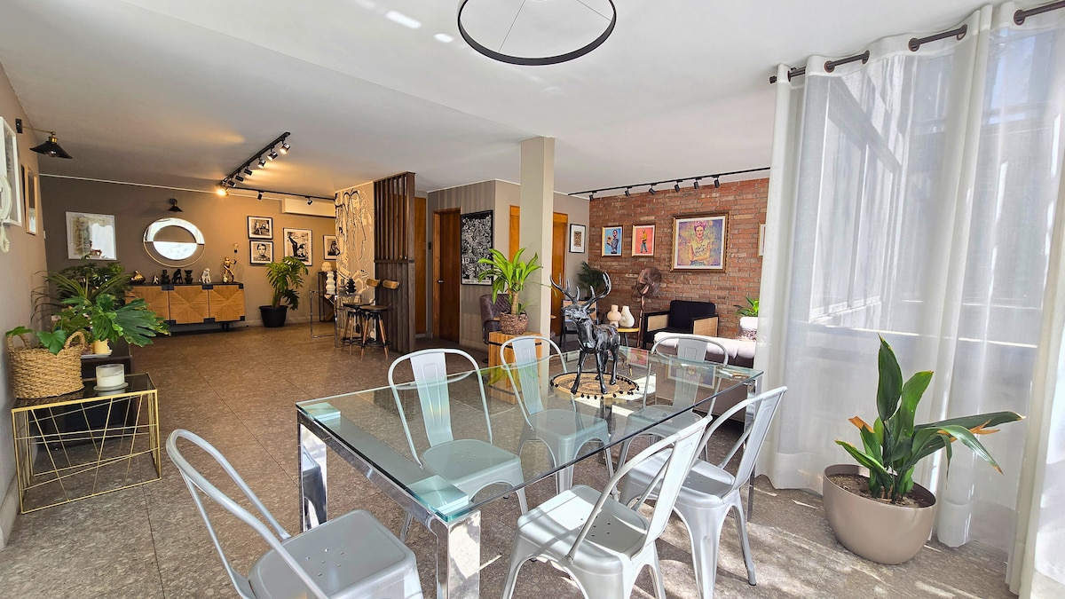 Velkommen til Casa Ruka Det perfekte stedet å bo på i Santiago. Denne romslige luksusleiligheten (200 m²) i Providencia er utformet for grupper, familier eller reiser med venner som er ute etter komfort, beliggenhet og en unik opplevelse. 🛏 Plass til opptil åtte personer 📍 Privilegert beliggenhet Noen skritt fra Salvador-t-banestasjonen, foran Cerro San Cristóbal og i nærheten av de viktigste turistområdene i Santiago. 🛋 Områder å dele Stue, spisestue og fellesarealer
