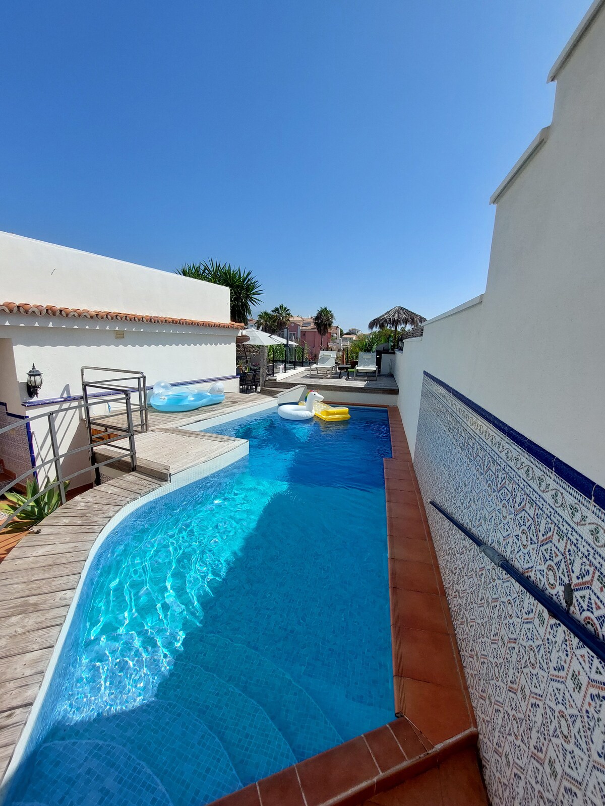 Opplev den ekte middelhavslivsstilen i denne vakre villaen som ligger bare en kort spasertur fra stranden. Huset har et privat basseng på 3,20 x 3,20 m, med en dybde på 1,25 m – ideelt for å kjøle seg ned og slappe av i solen. Villaen har tre store soverom, hvert med eget bad for maksimal komfort. Alle soverommene har dobbeltsenger, og det er mulig å legge til en enkeltseng i ett av dem om nødvendig.